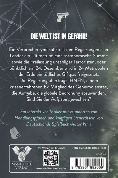 Nach einer saisonal bedingt kurzen Erstkarriere als Hardcover (im Verlag arsEdition unter dem Titel »DU entscheidest – Das Weihnachts-Ultimatum«) kehrt das erste und einzige deutschsprachige Thriller-Spielbuch aller Zeiten jetzt zurück: »ULTIMATUM!«, ein actiongeladenes Weltrettungsszenario mit deutlichem James-Bond-Einschlag, exotischen internationalen Schauplätzen, wilden Schießereien, Explosionen und vielem mehr, ist ab sofort als aufwendig gestaltetes Paperback im Mantikore-Verlag erhältlich. Auf der Webseite des Verlags gibt es darüber hinaus Hilfestellungen und Lösungen zu den im Buch enthaltenen Rätseln und Logikaufgaben.